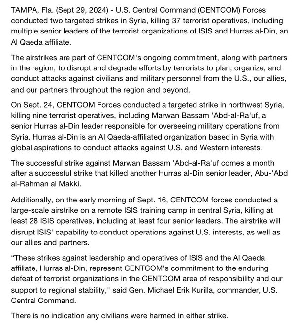 PeyamaKurd - Fermandehiya Navendî (CENTCOM) ya Dewletên Yekbûyî yên Amerîkayê (DYA) ragihand ku di hêrişên hêzên wan ên li Sûriyeyê yên 16 û 24ê Îlonê de, di nav wan de serkirdeyên payebilind ên rêxistina Huras El-Dîn a girêdayî DAIŞê û El Qaîdeyê, bi giştî 37 kes hatine kuştin.