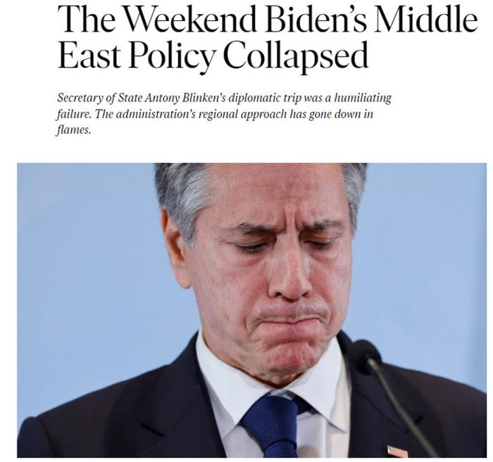 'Hafta sonu Biden'ın Orta Doğu politikası çöktü' başlığını kullanan ABD'nin prestijli yayınlarından The Nation, Blinken'ın diplomatik gezisinin utanç verici bir başarısızlık olduğunu kaleme aldı.