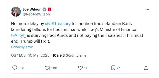 Joe Wilson, X sosyal medya platformunda paylaştığı bir mesajda, "ABD Hazinesi'nin Rafidain Bankası'na yaptırımları ertelemeyi durdurması" çağrısında bulundu. Wilson'a göre bu banka Irak milislerine milyarlarca doları aklamakta.